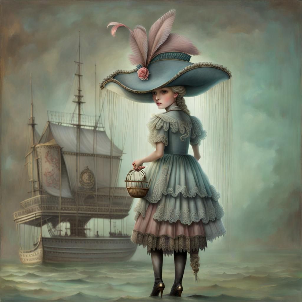 A surreal image of Victorian lace in a pop-surrealistic style. The artwork evokes 18th-century French and Italian art with intricate details, dramatic lighting, and a fantastical atmosphere reminiscent of a floating metropolis.