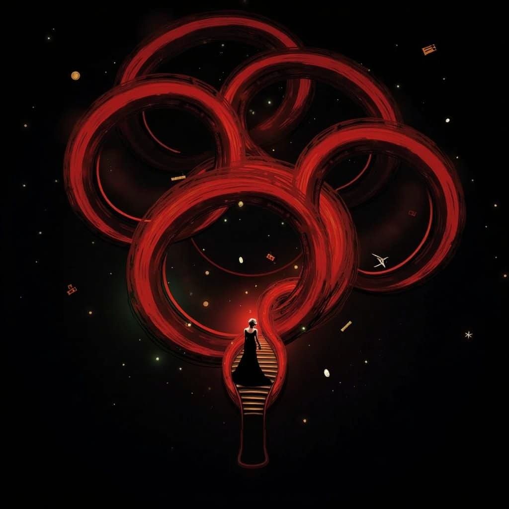 This image shows a woman in an Art Deco gown on a spiraling staircase beneath an abstract sky. The hyperrealistic concept art features scattered objects and moody, atmospheric lighting with vibrant color gradients.