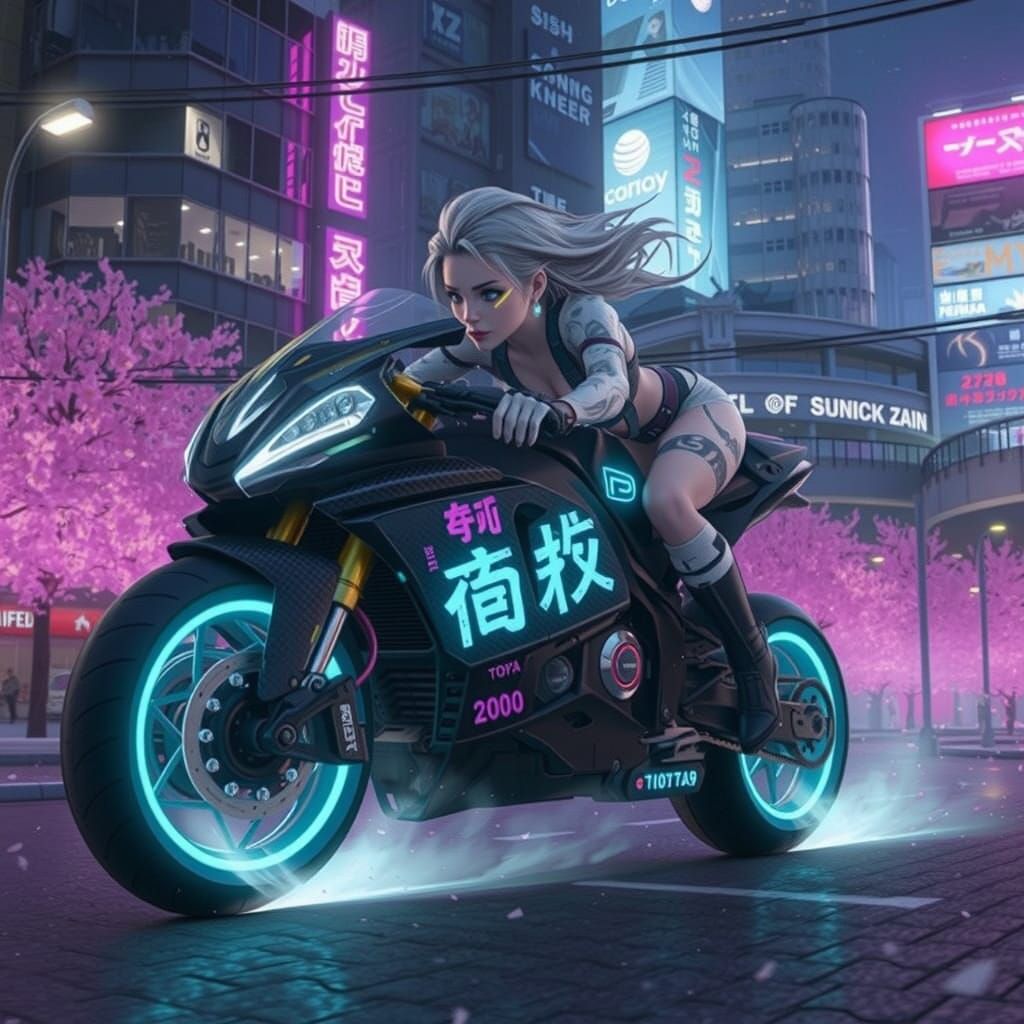 A striking picture of a cyber-street racer on a futuristic motorcycle speeding through neon-lit Tokyo in 2090. The image blends Syd Mead's futurism with a neon noir aesthetic reminiscent of Blade Runner 2049.