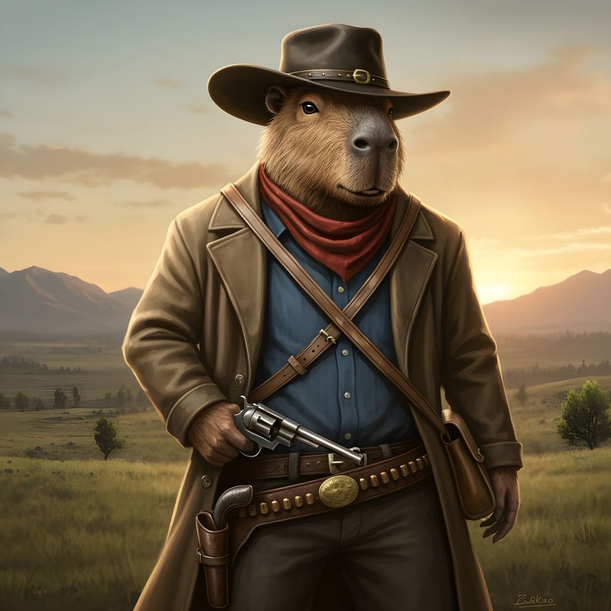 This image shows an anthropomorphic capybara dressed as a cowboy in a rugged Wild West setting. It features a warm sunset over rolling plains and mountains, capturing an adventurous spirit.