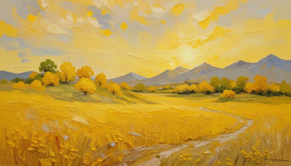 This image showcases a minimalist landscape rendered in vibrant yellow glowing tones with a thick impasto painting style.