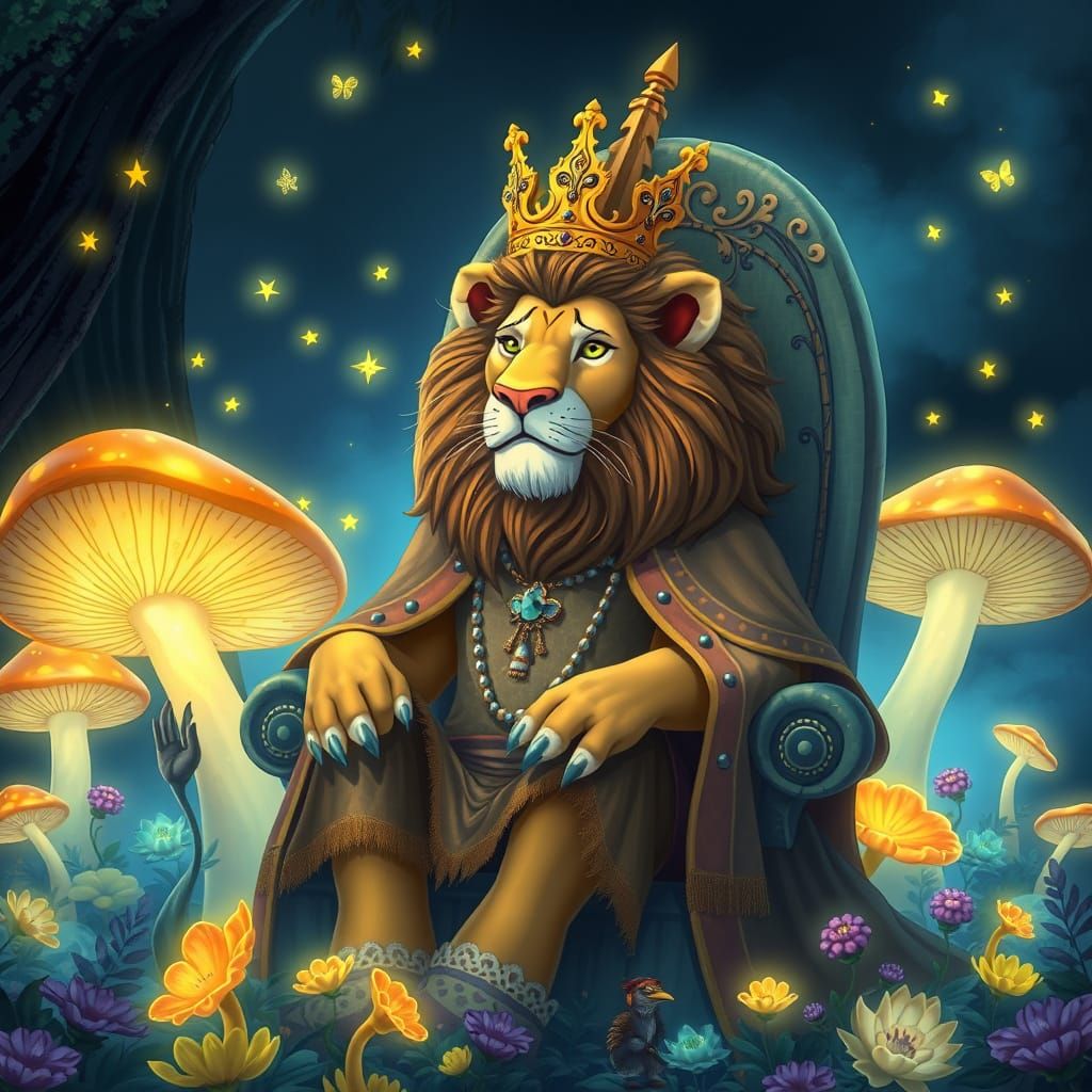 A majestic lion sits enthroned amidst luminous mushrooms in a magical forest. The scene is rendered in soft, dreamlike colors and intricate details, reminiscent of animation. The overall aesthetic evokes a sense of wonder.