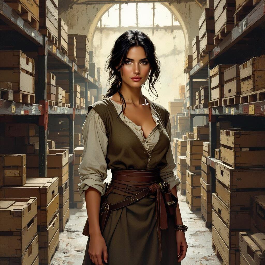 This image shows a dark-haired woman in merchant clothes standing in a warehouse. The image features earthy tones, rustic realism and atmospheric lighting.