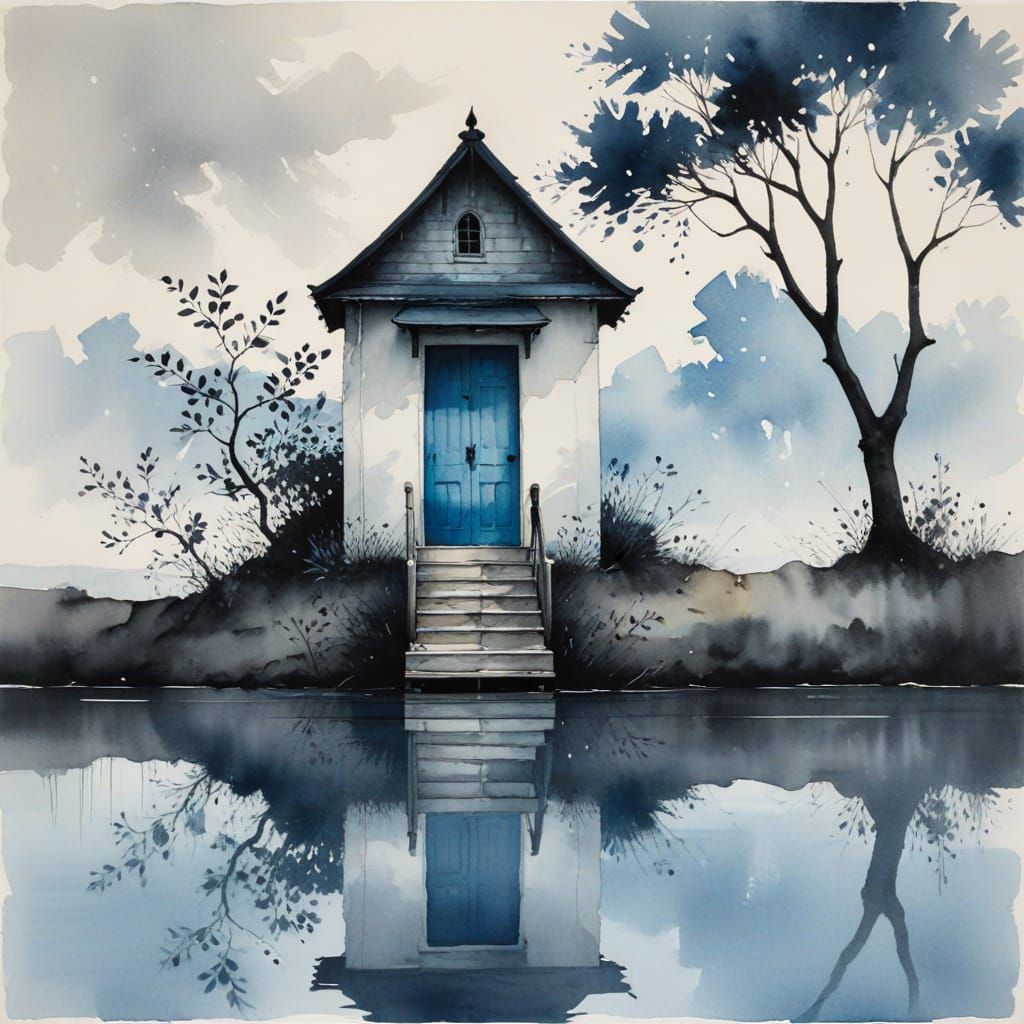 This image shows a quaint house with a blue door rendered in Indian ink. The artwork features calligraphic strokes, delicate tonal gradations, and minimalist aesthetics, depicting a serene waterside scene.