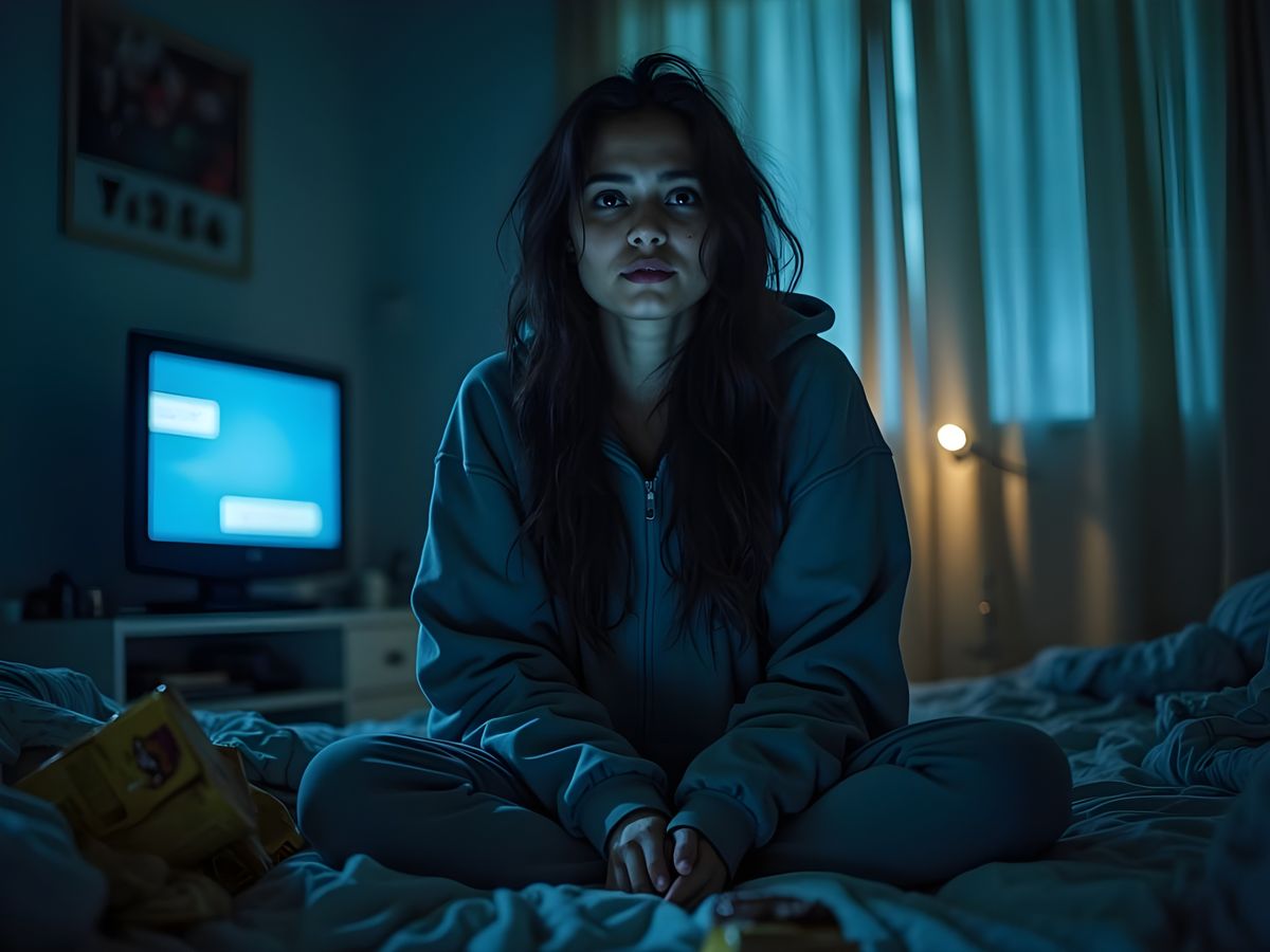 This image shows a young South Asian woman sitting alone in a dimly lit, cluttered bedroom, surrounded by signs of emotional struggle and self-isolation.