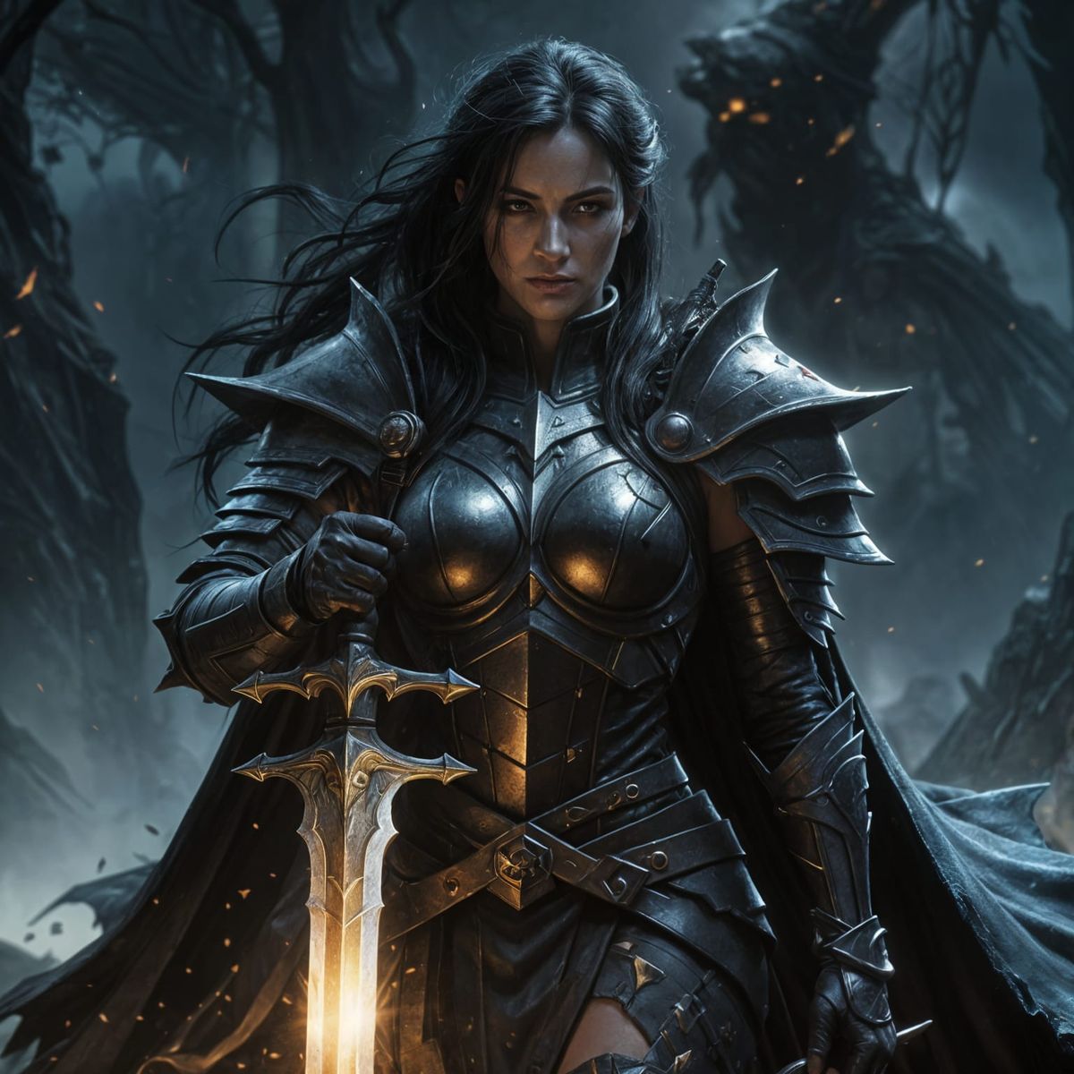 This image showcases a stunning dark fantasy female warrior with black hair, clad in torn battle armor, amidst a cinematic atmosphere with perfect composition and high contrast.
