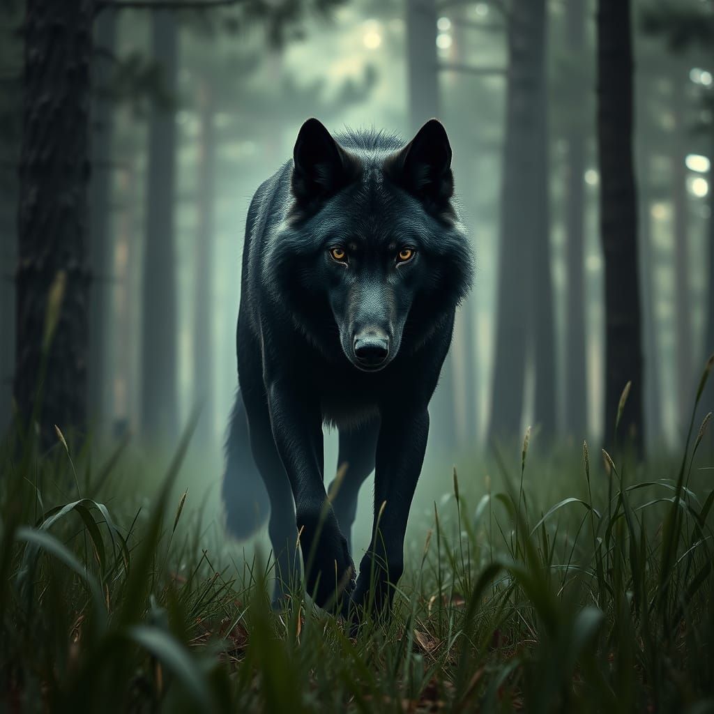 This image shows a majestic, black wolf roaming through a misty Florida forest, surrounded by towering pine trees and swaying grass, in a mystical, atmospheric style with earthy textures and moody lighting.