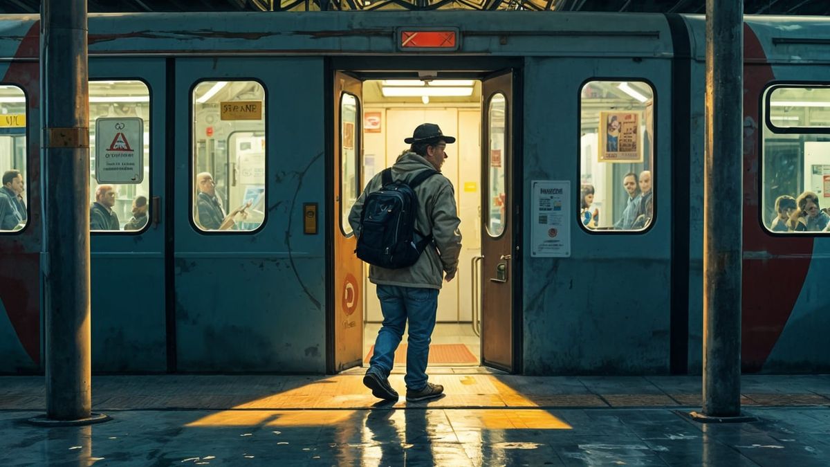 A comical illustration of a mishap at San Jose Tram Station. A tourist becomes stuck in the tram doors, creating a tense yet satirical scene as the guide rushes to help.