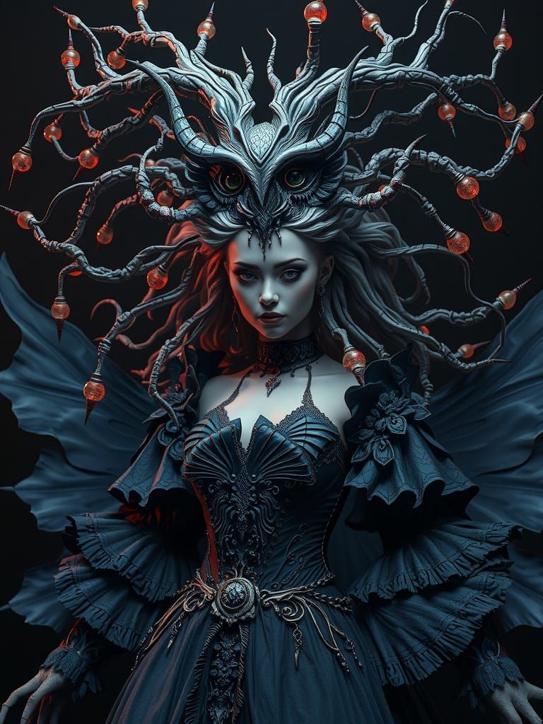 This image shows a sorrowful woman in an ornate, dark setting. She wears elaborate attire and has striking, electrified hair, rendered with sculpted details in an expressionistic style.