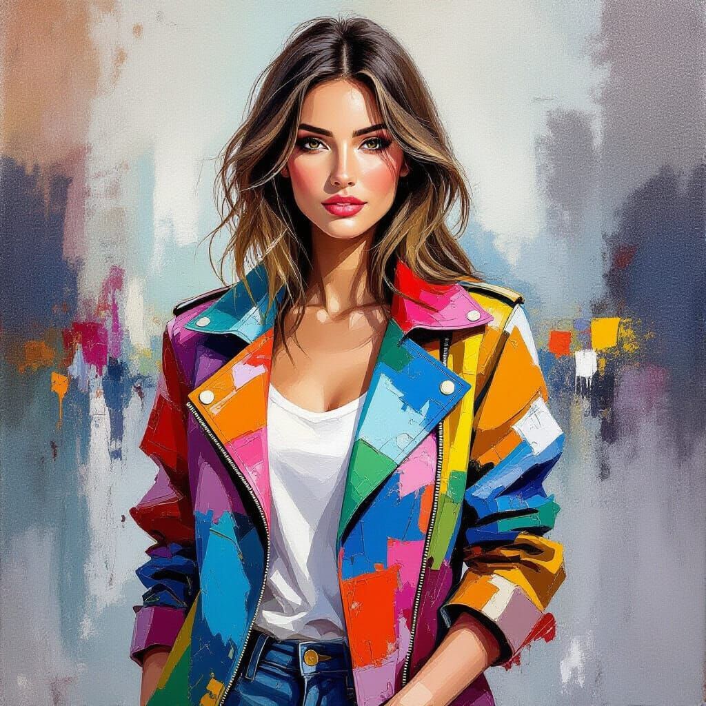 This image shows a woman in a jacket seemingly made of fragmented colors in the style of an oil painting. The colors splash outwards creating an abstract effect.