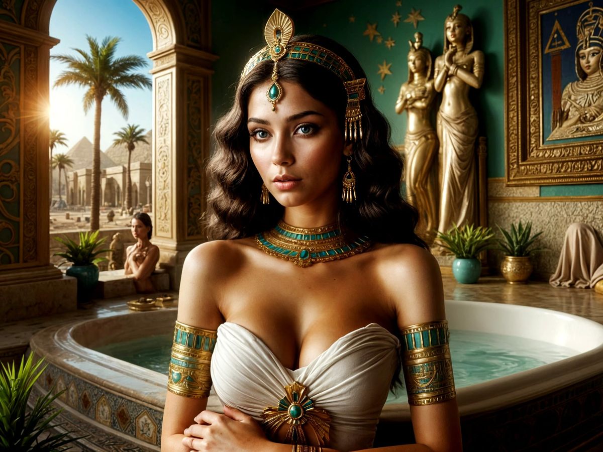 This image depicts a beautiful Egyptian princess preparing for a bath in her private chambers. The artwork features soft lighting and emphasizes her green eyes and curvaceous figure.