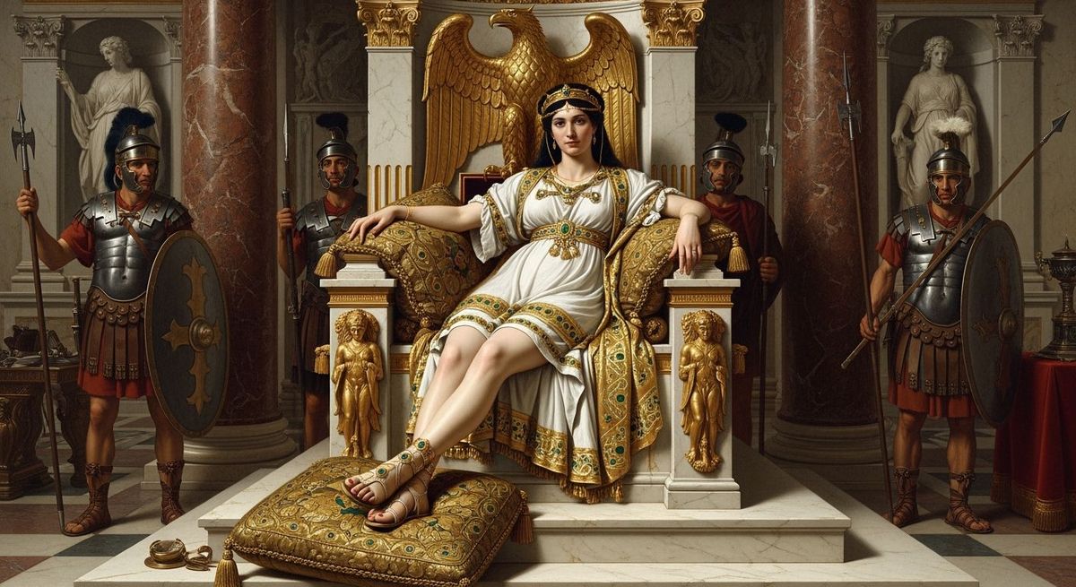 This image shows Empress Messalina on a gold-plated throne. Roman legionnaires stand guard in the grand throne room, enhanced with marble columns and opulent details. The artwork evokes a realistic, photorealistic style.