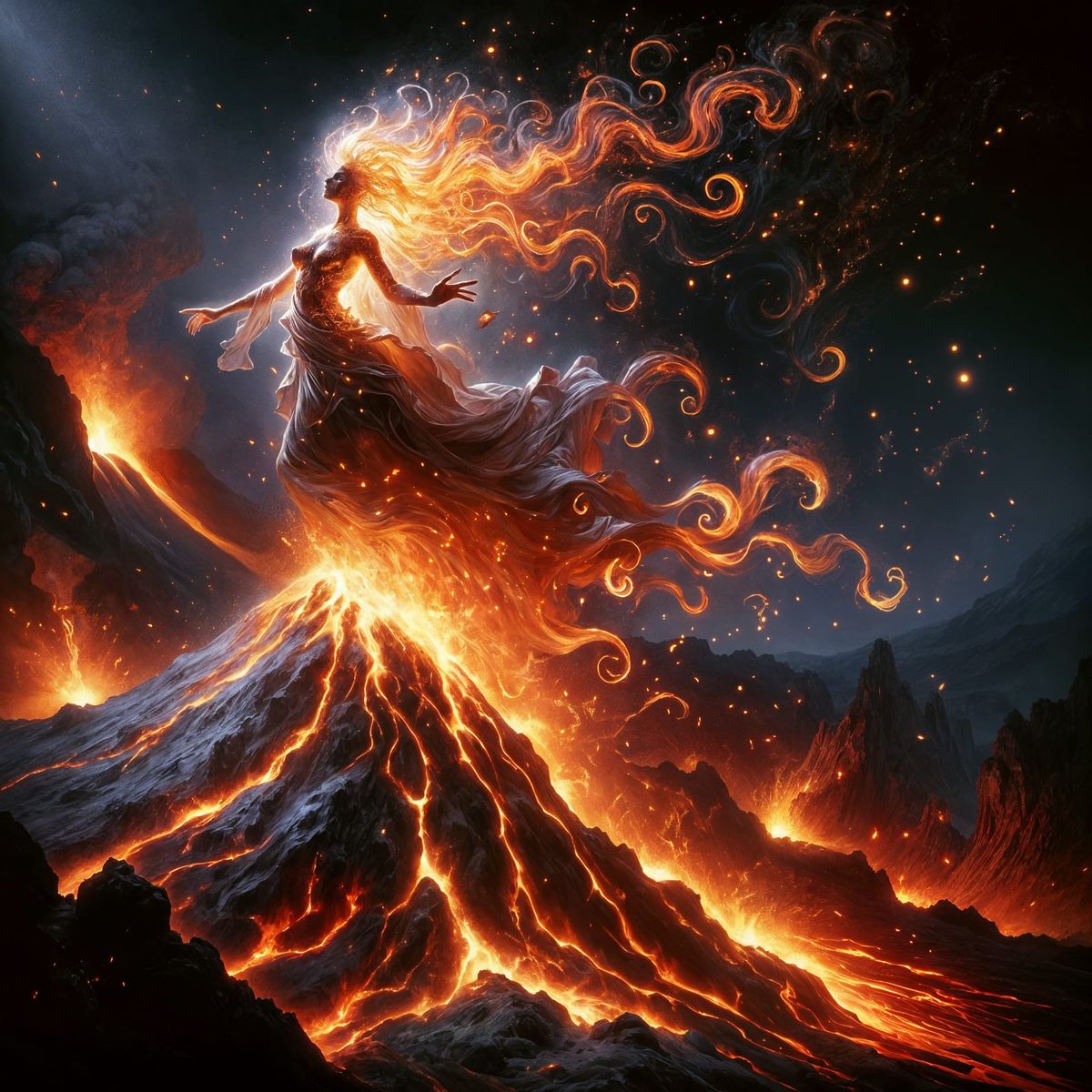 This image shows a powerful fire elemental emerging from a volcanic caldera, surrounded by molten rock and a haunting atmosphere. Illustrated in a style reminiscent of Italian Renaissance chiaroscuro, with soft edges and dramatic contrasts between light and dark.