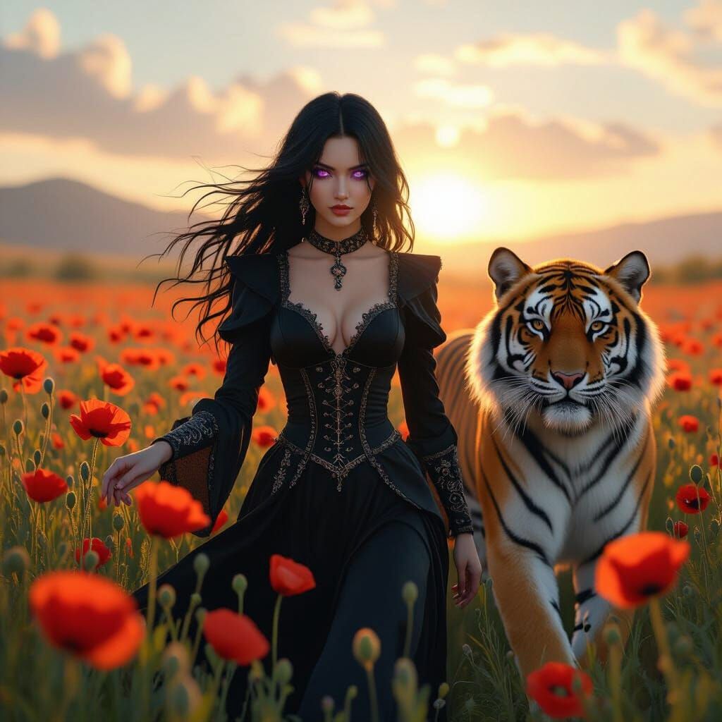 This image shows a sorceress with black hair and violet eyes walking through a poppy field with a majestic tiger. Golden sunlight creates a fantastical, detailed scene in deep colors.
