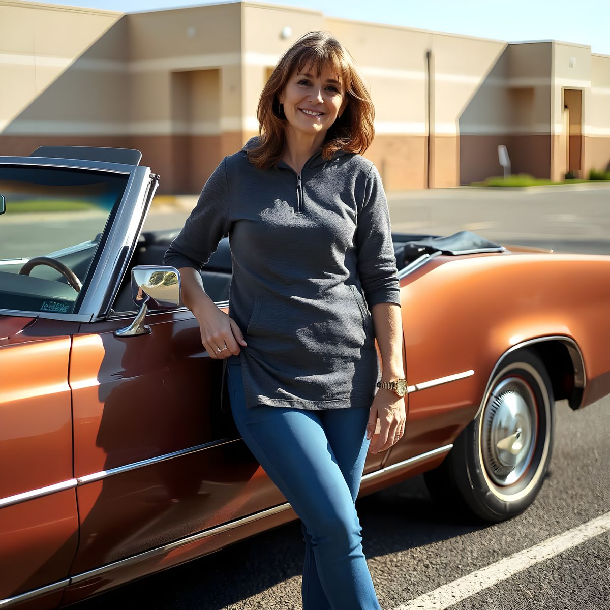 This image captures a carefree woman from the 50s standing beside a vintage 1968 Eldorado convertible, surrounded by a warm and sunny atmosphere, with a classic 1960s design and a friendly, nostalgic tone.