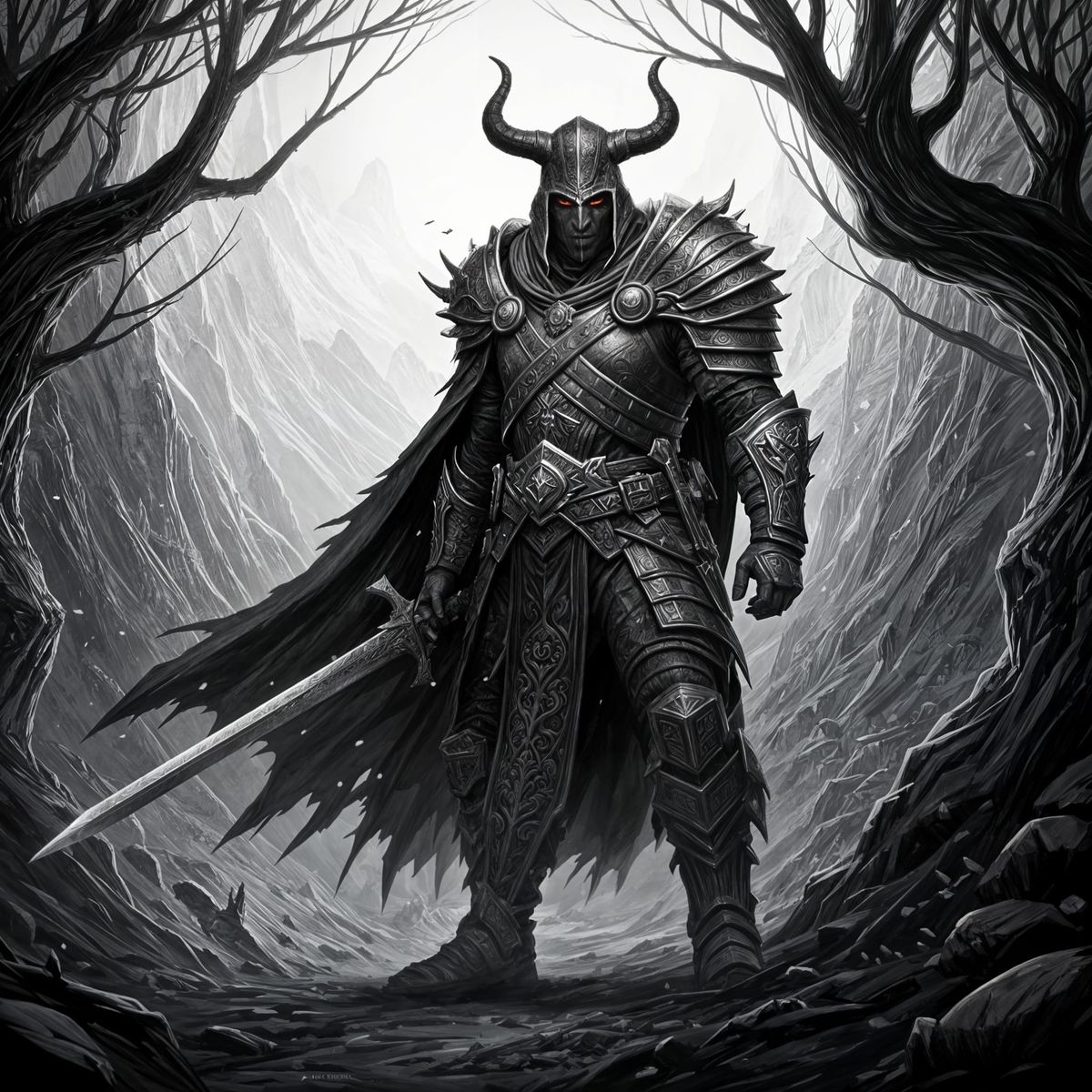 A black and white sketch of a fantasy landscape featuring doodle-style trees and mountains. A fantasy warrior with a horned hat and sword stands guard in this intricately detailed, dramatic scene.