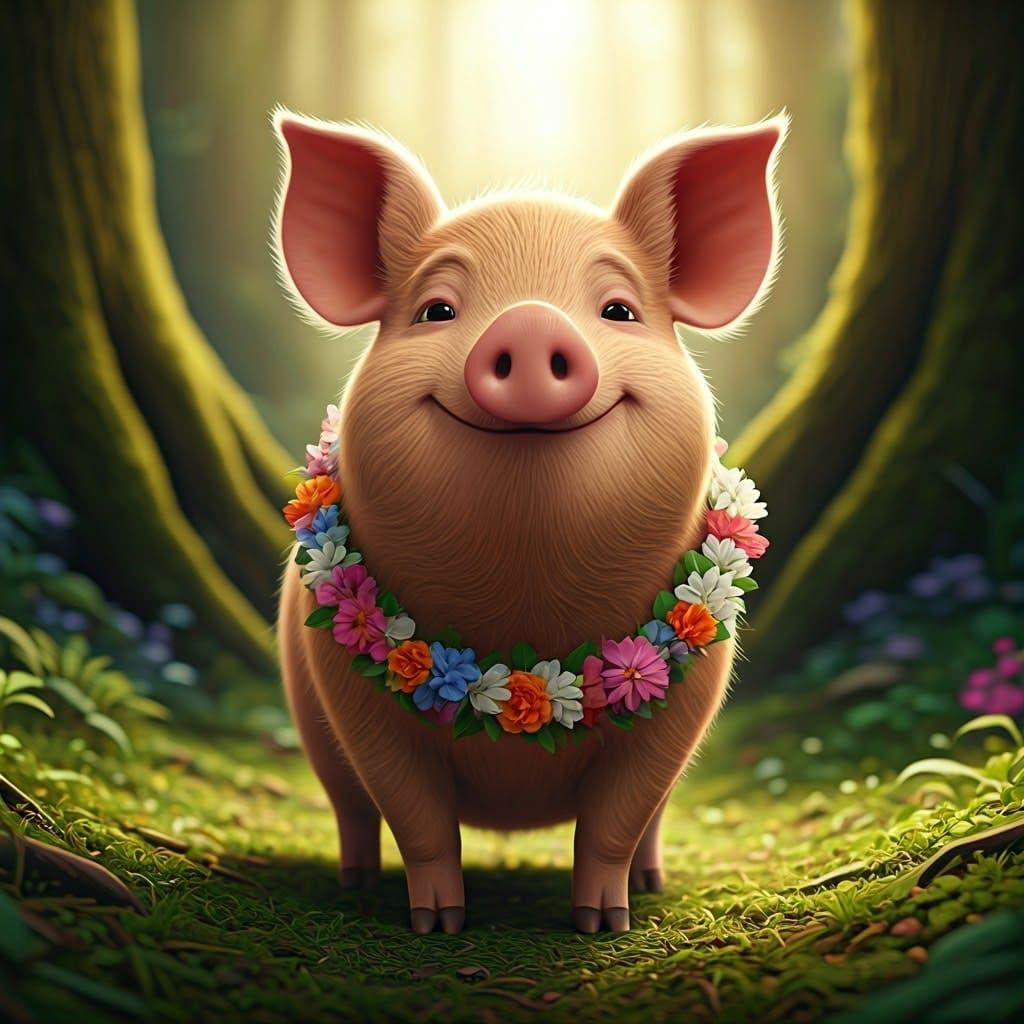 This image shows Sarah, a brown pig, in the Hundred Acre Wood. The Pixar-style character wears a floral garland and smiles, with detailed fur and volumetric lighting, in a whimsical Disney-esque scene with a radial gradient backdrop.