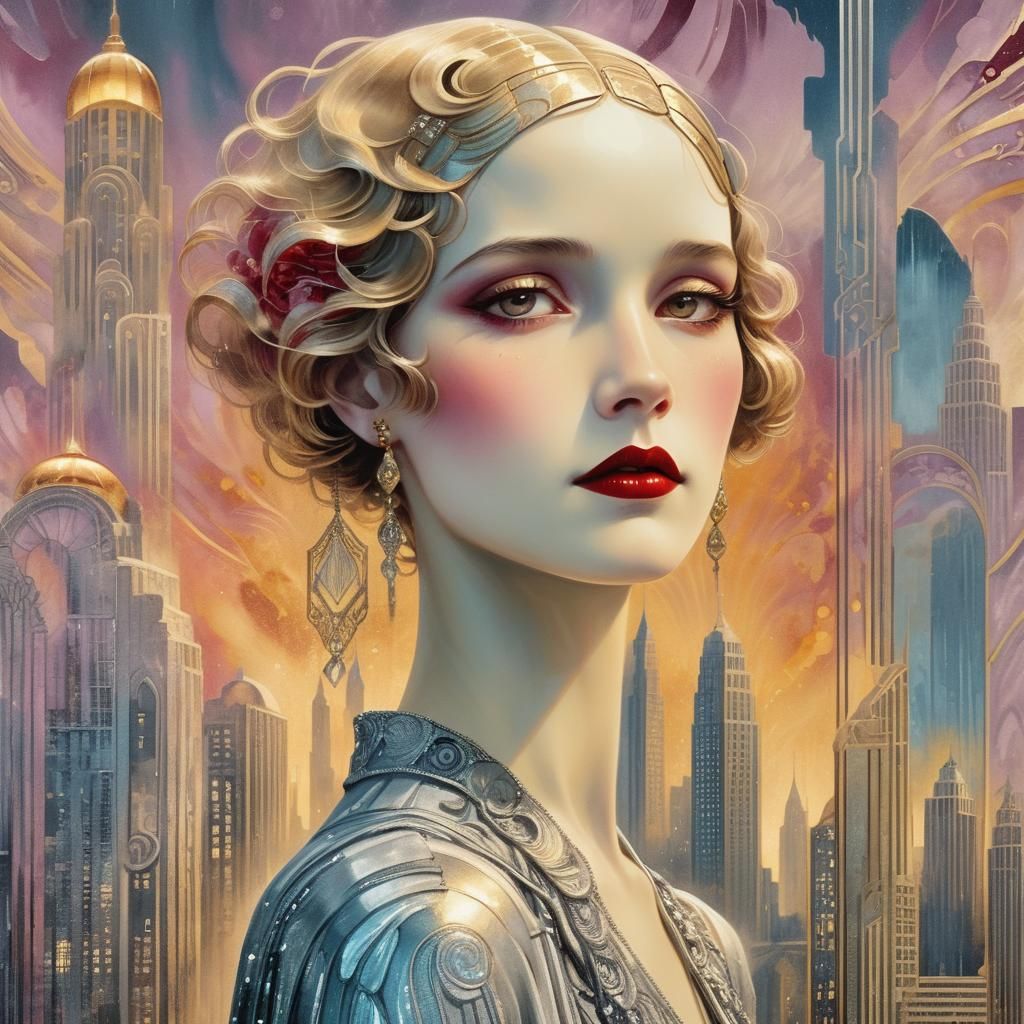 A surreal art deco image of a woman in 1920s clothing amidst a melting cityscape. The black and white portrait features crimson accents, intricate linework and shimmering textures.
