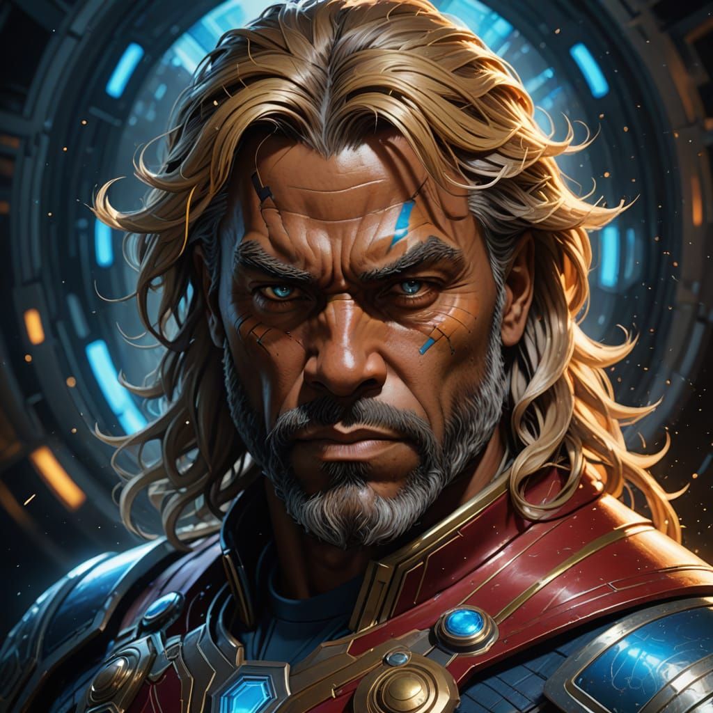 This stunning portrait captures the essence of a Starfleet officer with the strength of Thor and the honor of Worf, set against a backdrop of vibrant, triadic colors and intricate textures reminiscent of Alphonse Mucha's work, all brought to life with advanced rendering techniques and Unreal Engine 5