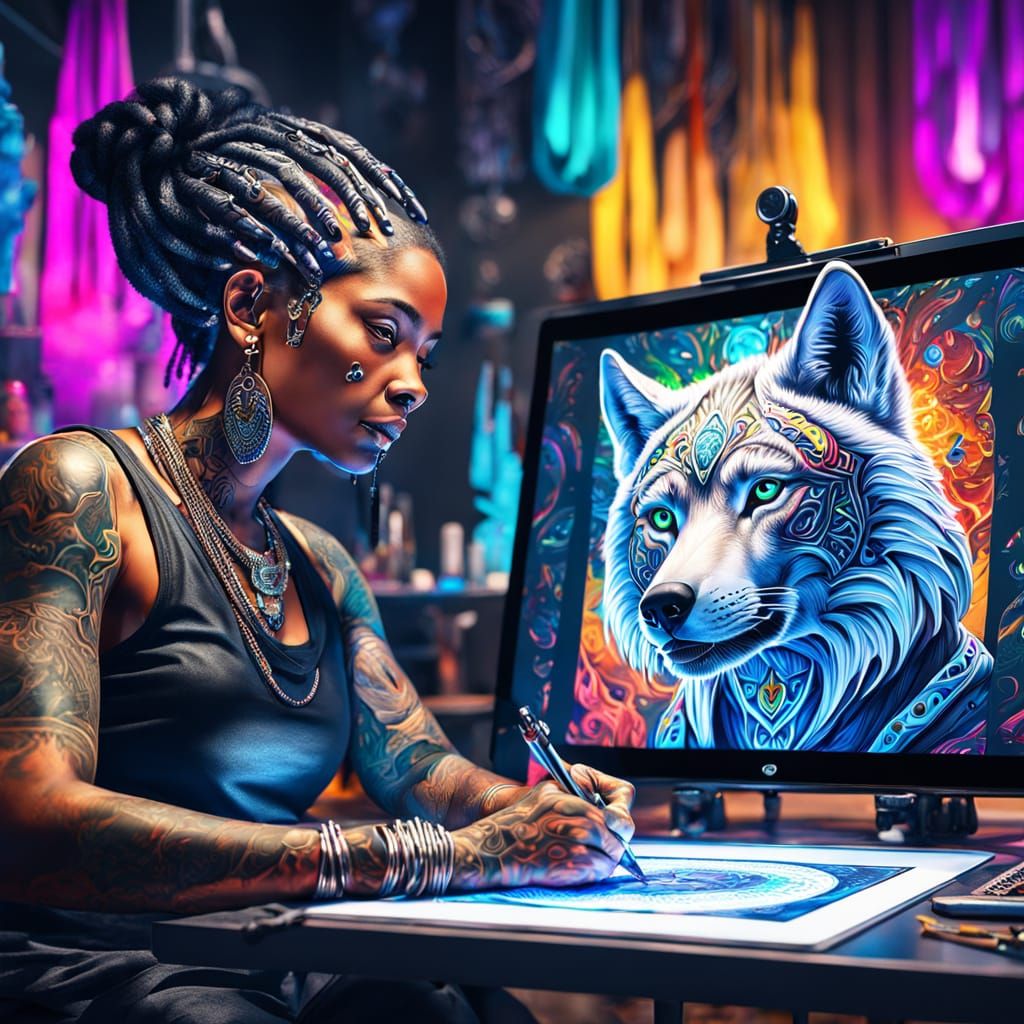 A black Egyptian female tattoo artist is meticulously crafting a portrait of a silver wolf on her Samsung Galaxy S10 Ultra tablet in her studio. The studio is filled with vibrant tattoo designs and colorful inks. Hyperrealistic, splash art, concept art, mid shot, intricately detailed, color depth, dramatic, side light, colorful background.