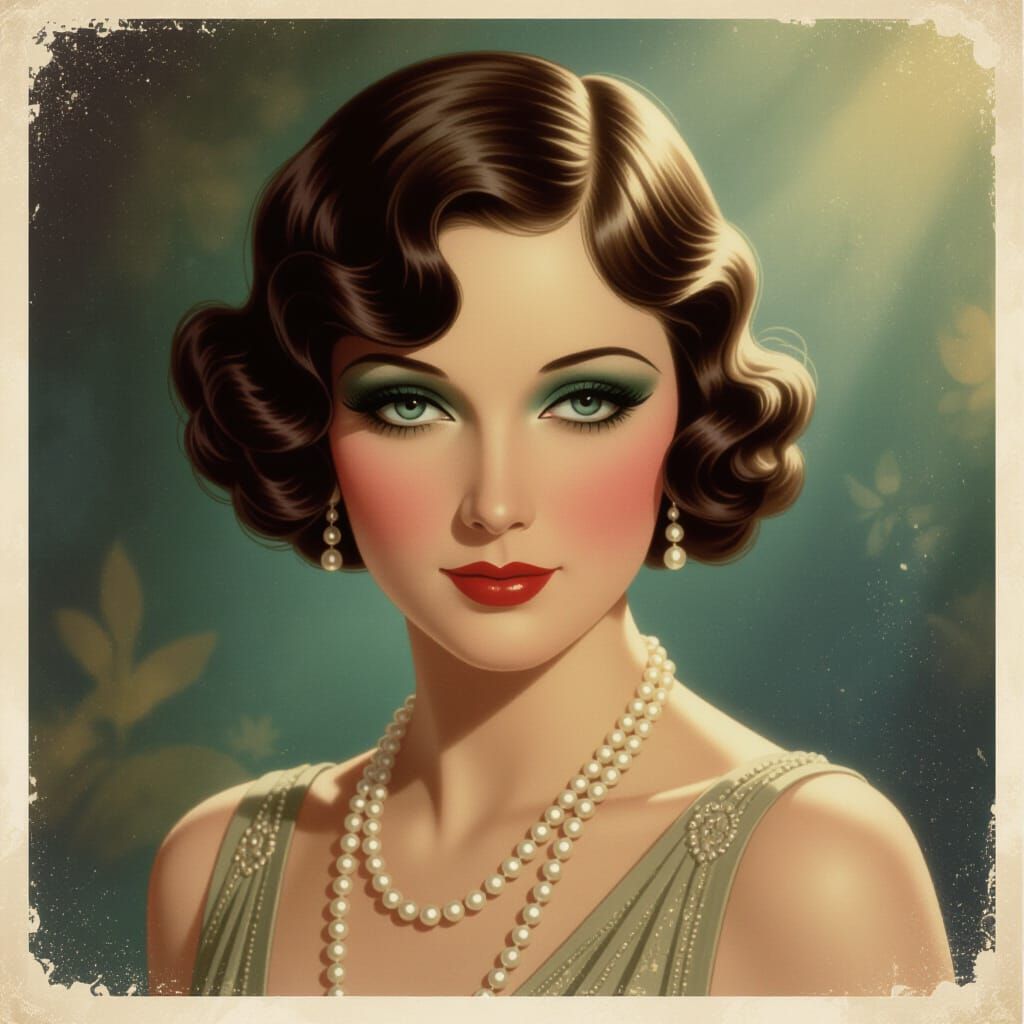 A captivating vintage-inspired portrait of a 1920s Hollywood film goddess, expertly capturing the timeless elegance and mysterious glamour of the Golden Age. Her face, framed by perfectly styled finger waves, exudes cool sophistication, while her dark, kajal-accented eyes hold a hint of secrets and longing. ...