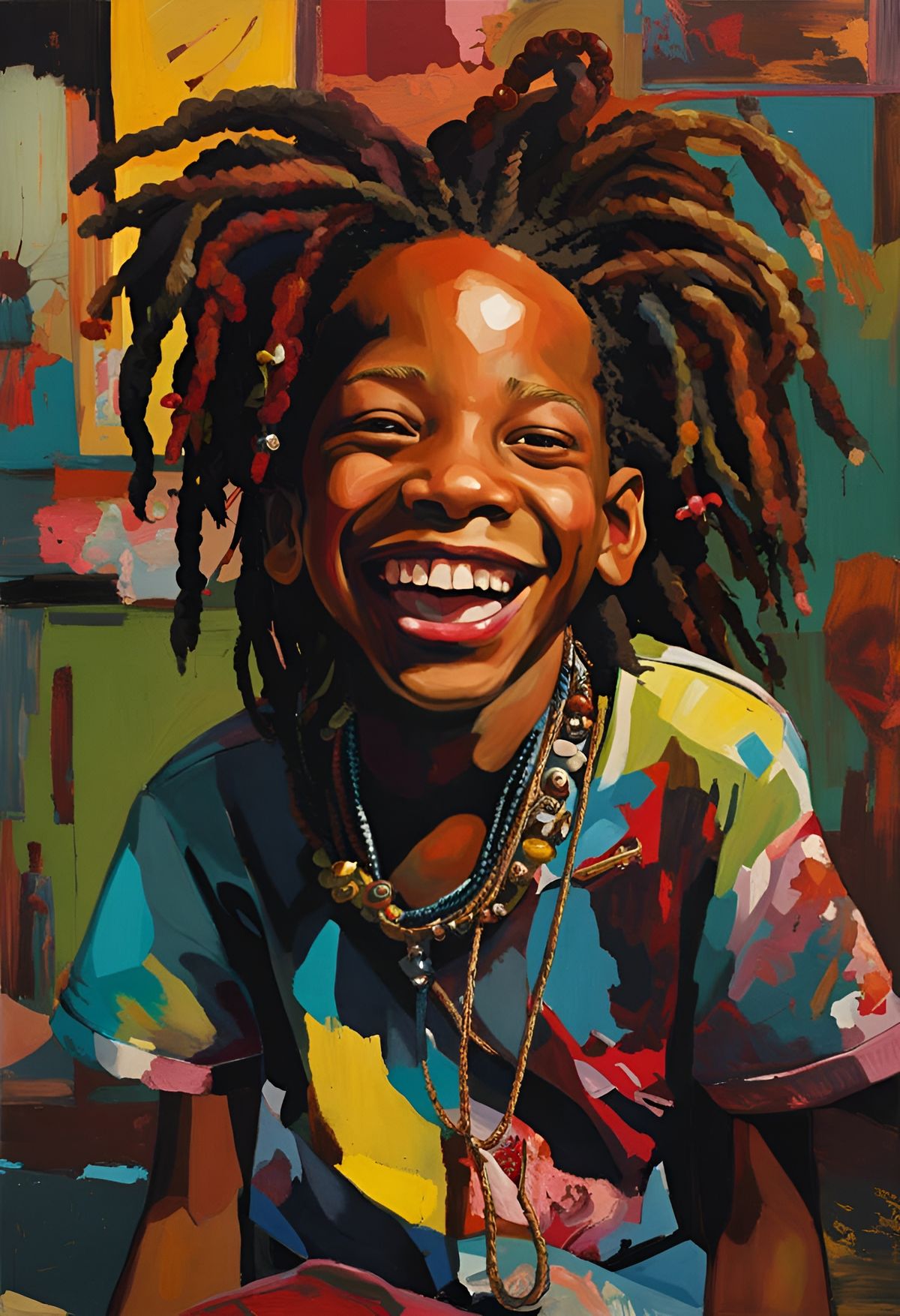 A vibrant portrait of a young boy with dreadlocks, overcome with laughter. The artwork features vivid colors and global illumination, capturing a funk and groovy aesthetic.