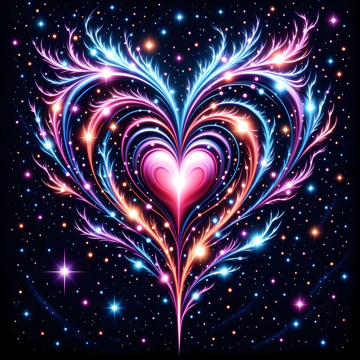A vibrant heart shape composed of swirling galaxies and nebulas against a dark, starry backdrop. This pop art image features well-defined shapes and a vivid color palette, rendered in hyperrealistic detail.