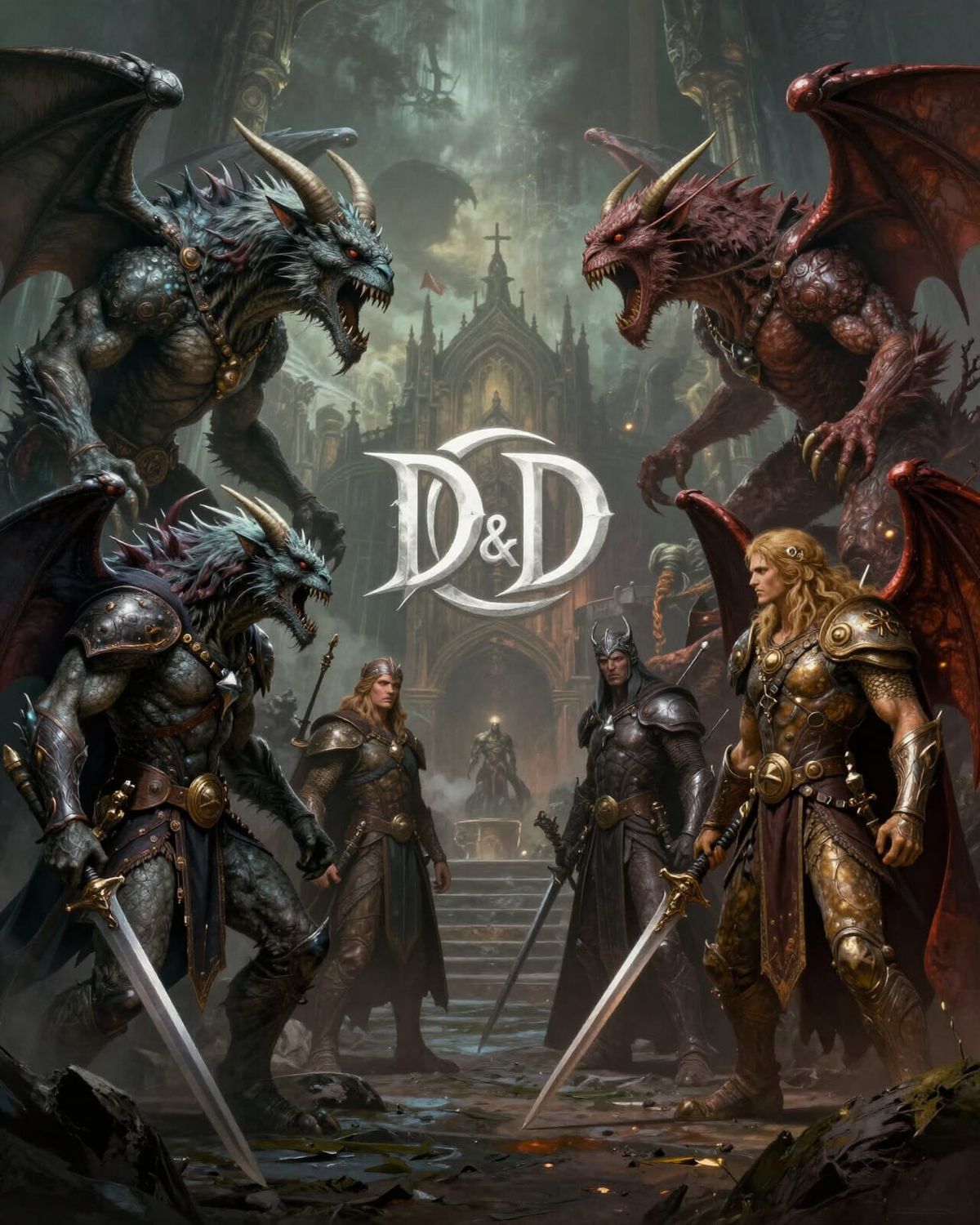 This image shows a dramatic fantasy scene with D&D monsters facing off against heroes, centered around the iconic D&D logo. Rendered in a detailed concept art style with intense lighting.
