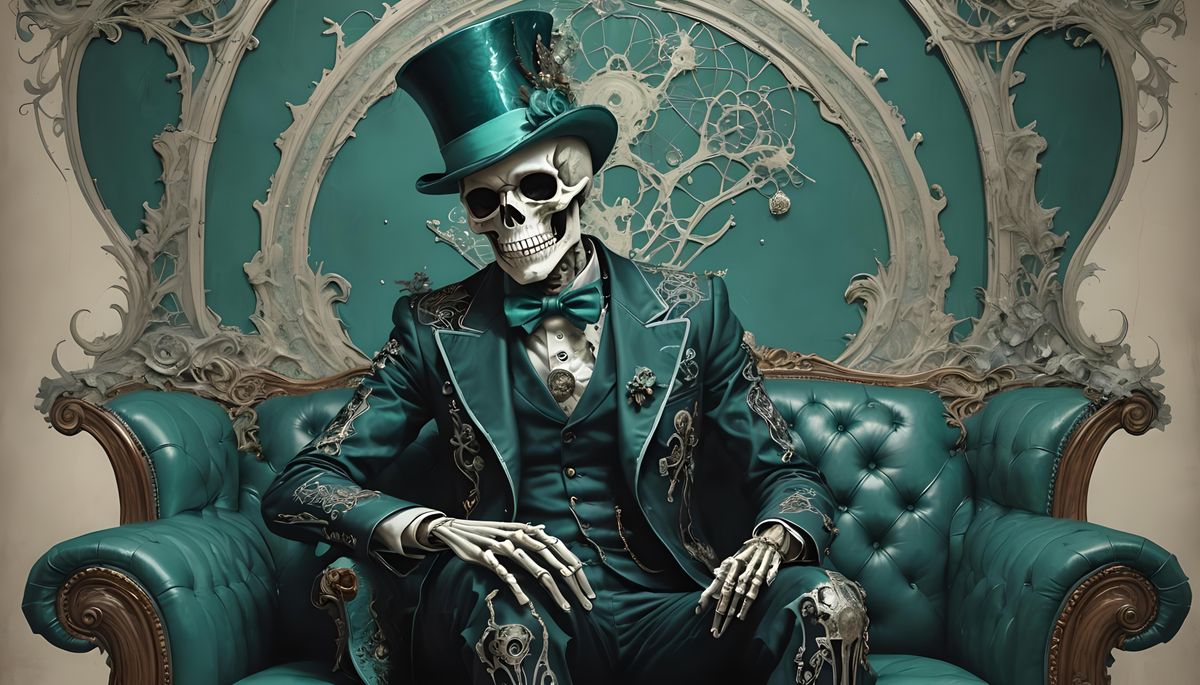 A digital painting of a skeleton baron in a teal top hat, posed on a vintage teal leather couch. The artwork features silver filigree, intricate motifs, and sparkling particles in a surreal style.
