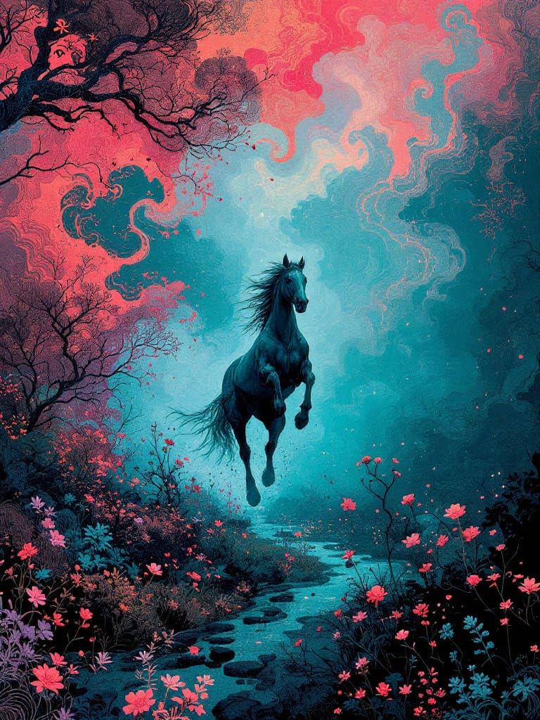 This image depicts a horse running freely, rendered with intricate linework and a rich jewel-toned color palette. The art style blends detailed organic lines with vibrant, contrasting colors and atmospheric depth.