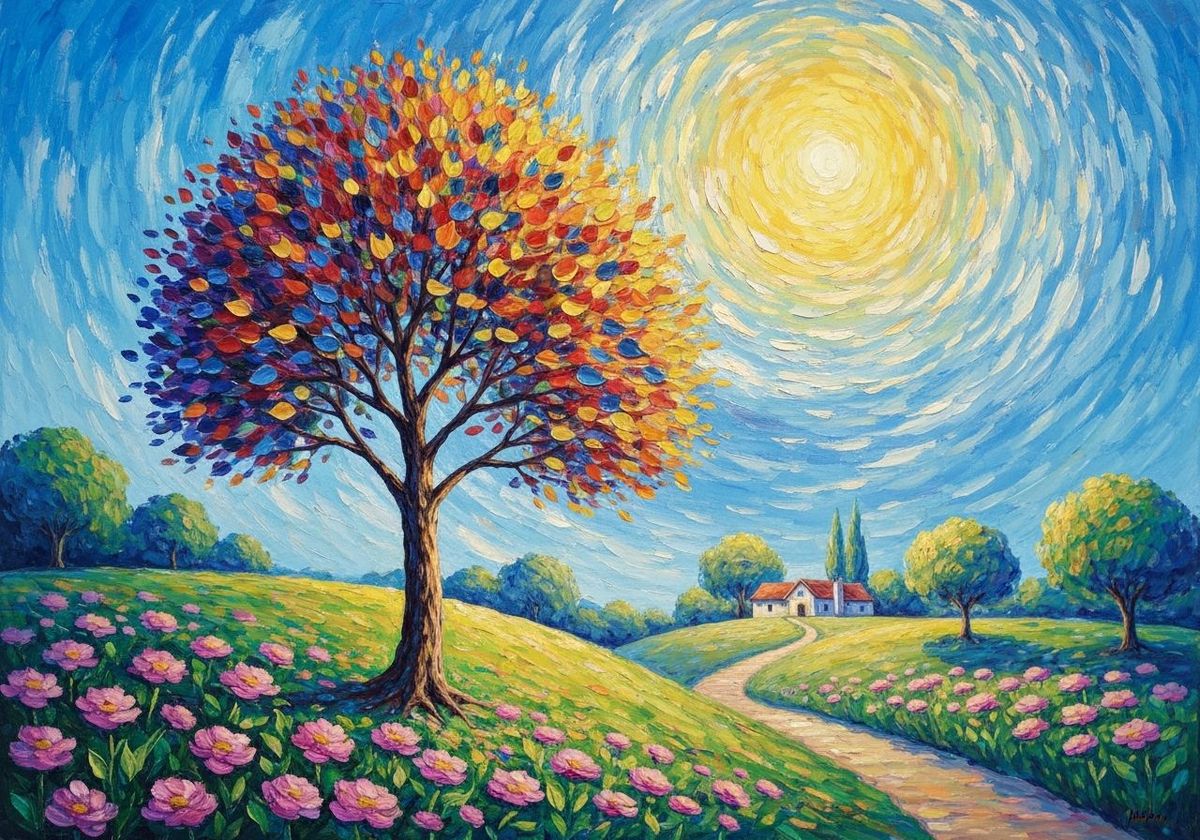 This image shows a vibrant, impressionist-style painting of a tree with multicolored leaves on a hill. A pathway leads to a house under a swirling, sunny sky.