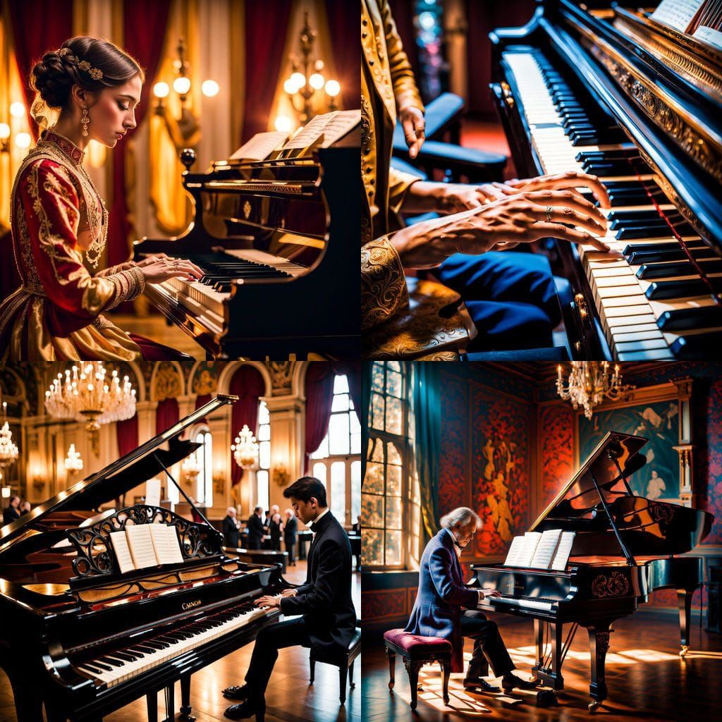 This image is a stunning representation of a classical piano in the romantic era style, featuring intricate details and vibrant colors. The scene is set for a dramatic and emotive performance, with the piano as the centerpiece of a passionate and poetic world.