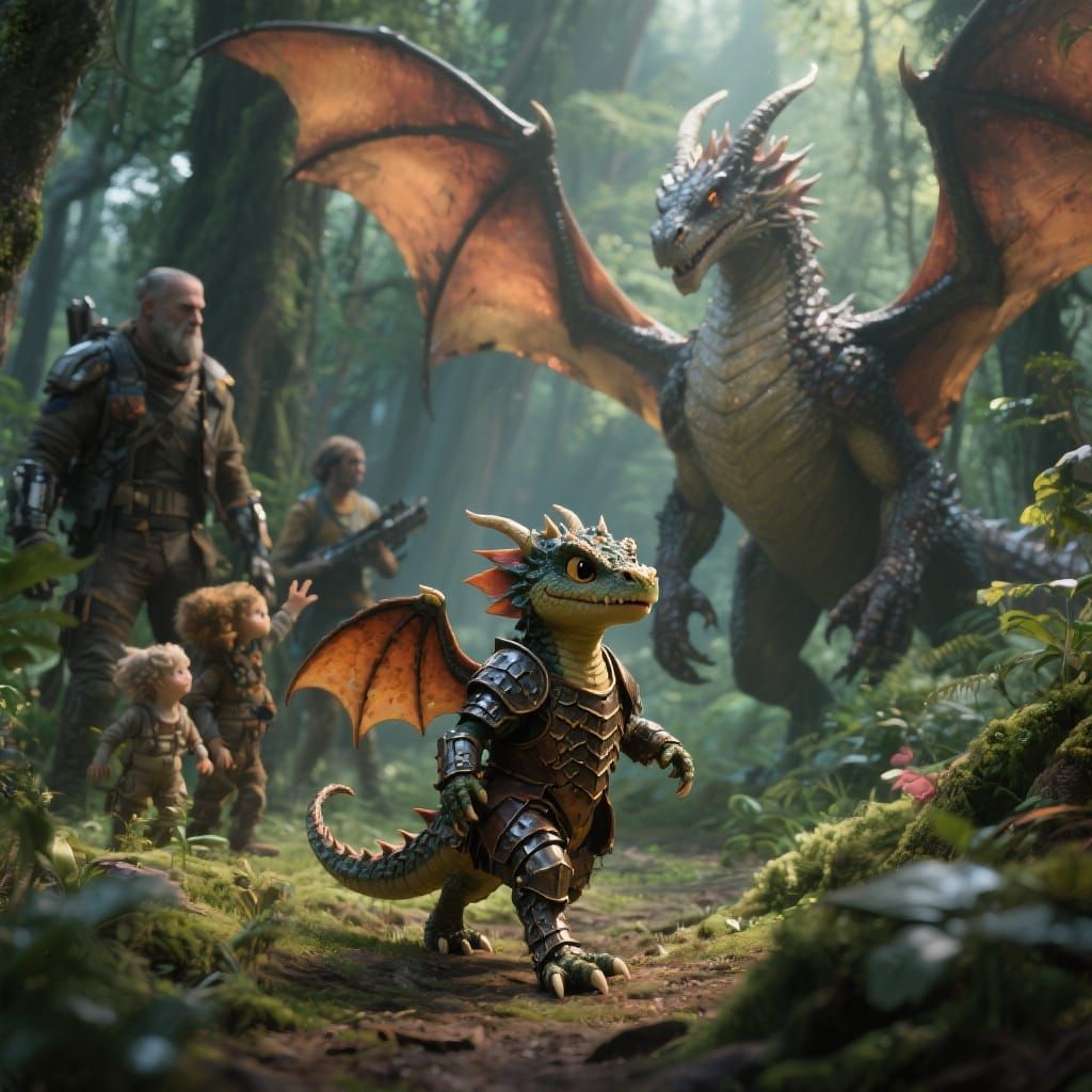 This image shows a small dragon in scaled armor encountering adventurers in a lush forest. He calls for his family, including his father, Fafnir, a majestic dragon with outstretched wings. Rendered with detailed textures and lighting.