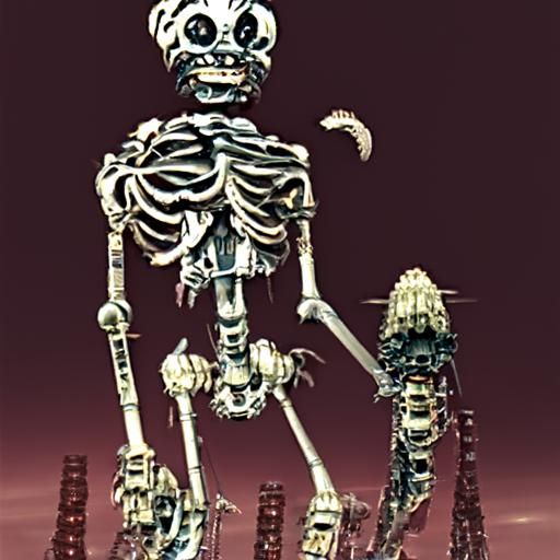 This image shows a giant skeleton yokai in a post-apocalyptic thunderstorm. The ethereal photorealistic illustration shows intricate details with depth of field, in a dystopian fantasy horror style.