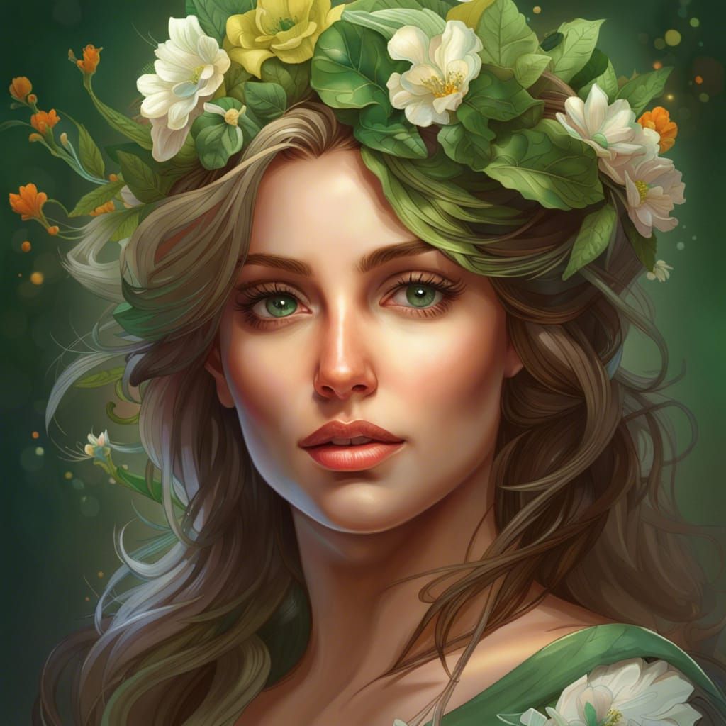 This image shows a beautiful woman with green eyes and flowers in her hair. The portrait is rendered as detailed 3D digital art with dynamic lighting and triadic colors.