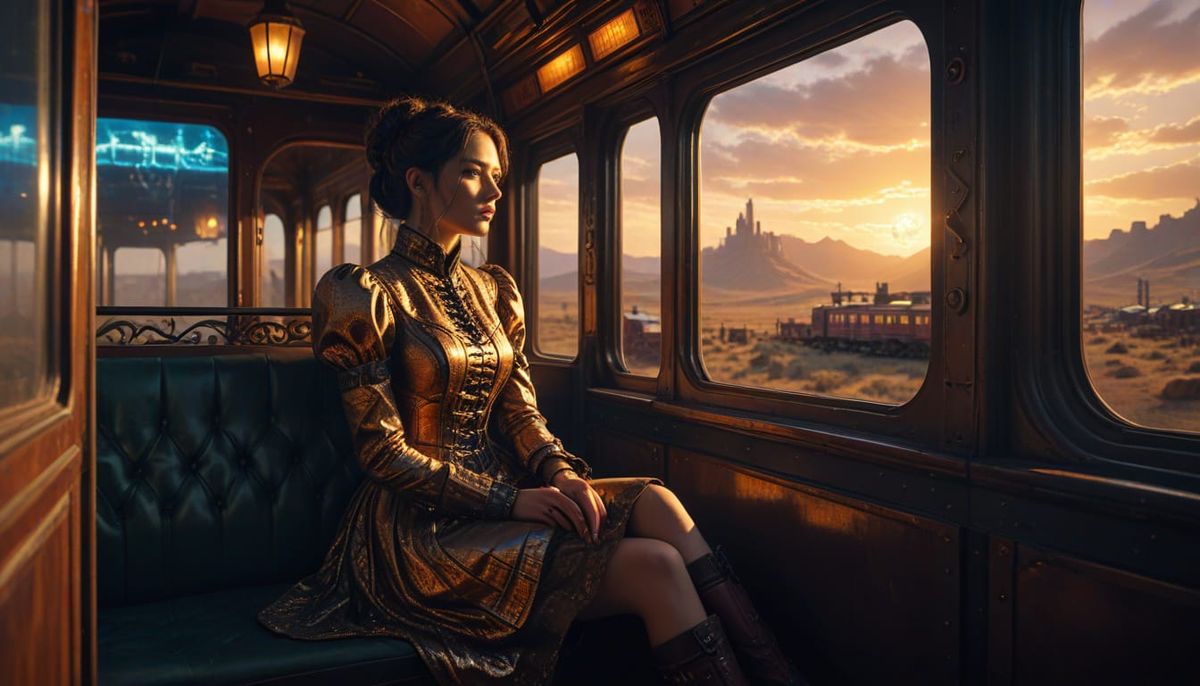 This image shows a woman in Victorian dress on a vintage train. She gazes out the window at a cyberpunk Wild West town, depicted with vibrant anime-inspired aesthetics and sci-fi elements.