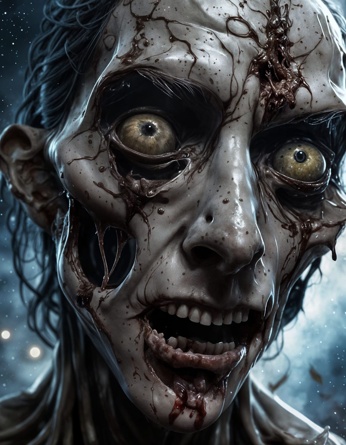This image shows fifteen deformed faces suspended beneath a starry night sky, exhibiting expressions of horror. The artwork features ghostly handprints, maggots and skeletal shadows in a disturbing, photorealistic and cinematic style.