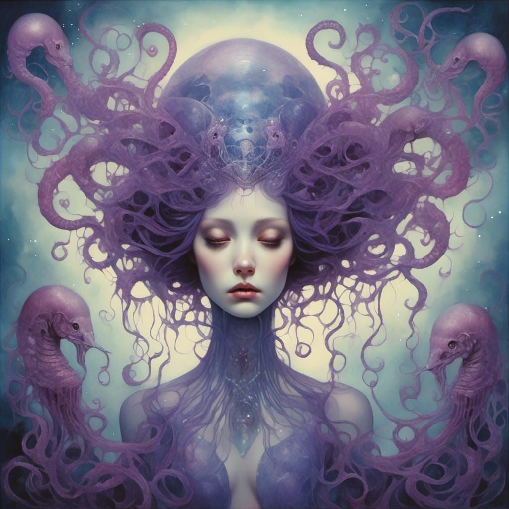 This image shows a purple jellyfish and seahorse with a symmetrical face emerging from mist. The artwork exhibits surrealist and biomechanical elements.