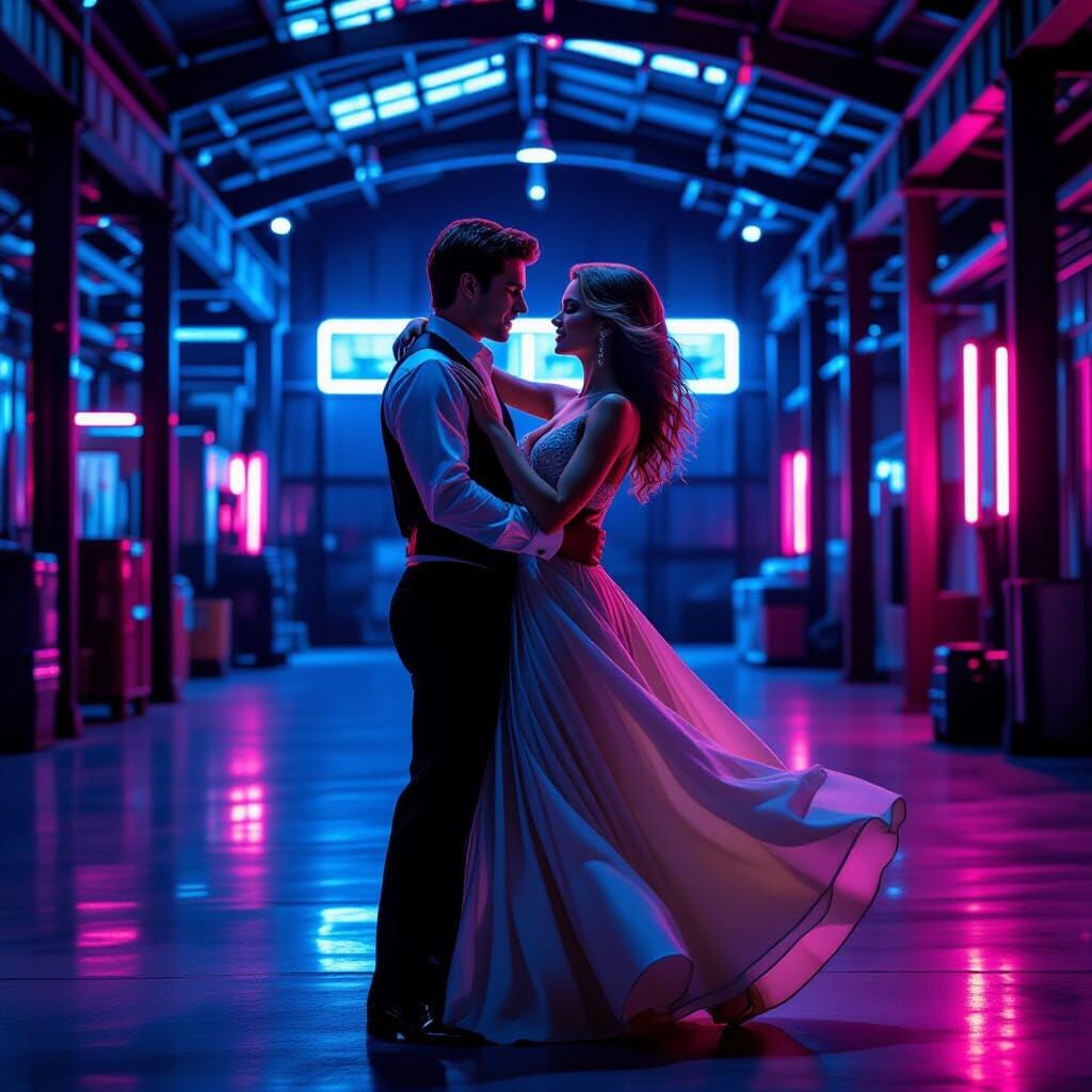 This image depicts a young male singer, Richie Adams, and Scarlett Johansson in a romantic dance scene. They are in a dimly lit, neon-lit metal warehouse in Los Angeles with a Syd Mead-inspired aesthetic.