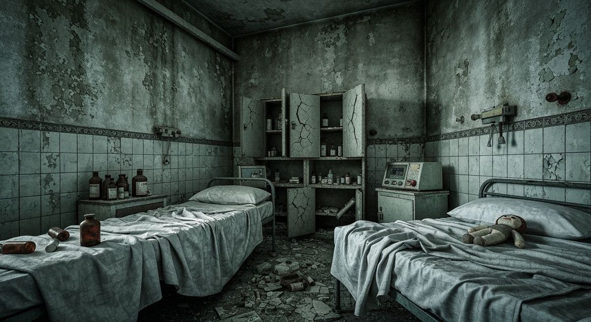 This image depicts a derelict psychiatric ward room with messy beds, old medicine bottles, and rusty equipment. Peeling paint and dirty walls enhance the grim atmosphere, illuminated by dim light.