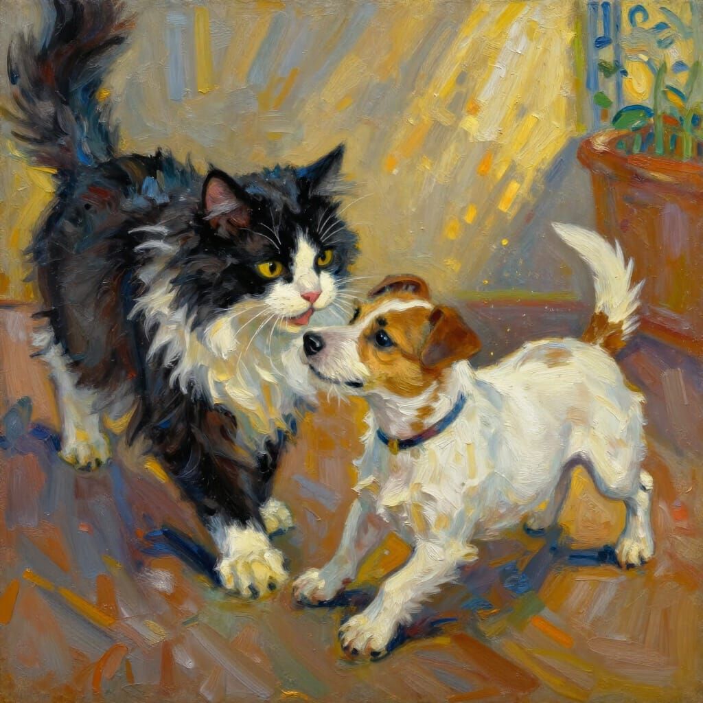 This image shows a large, furry black and white cat and a spotted Jack Russell terrier playing. Rendered in an expressive, impasto style with visible brushstrokes, warm lighting, and a cozy atmosphere.