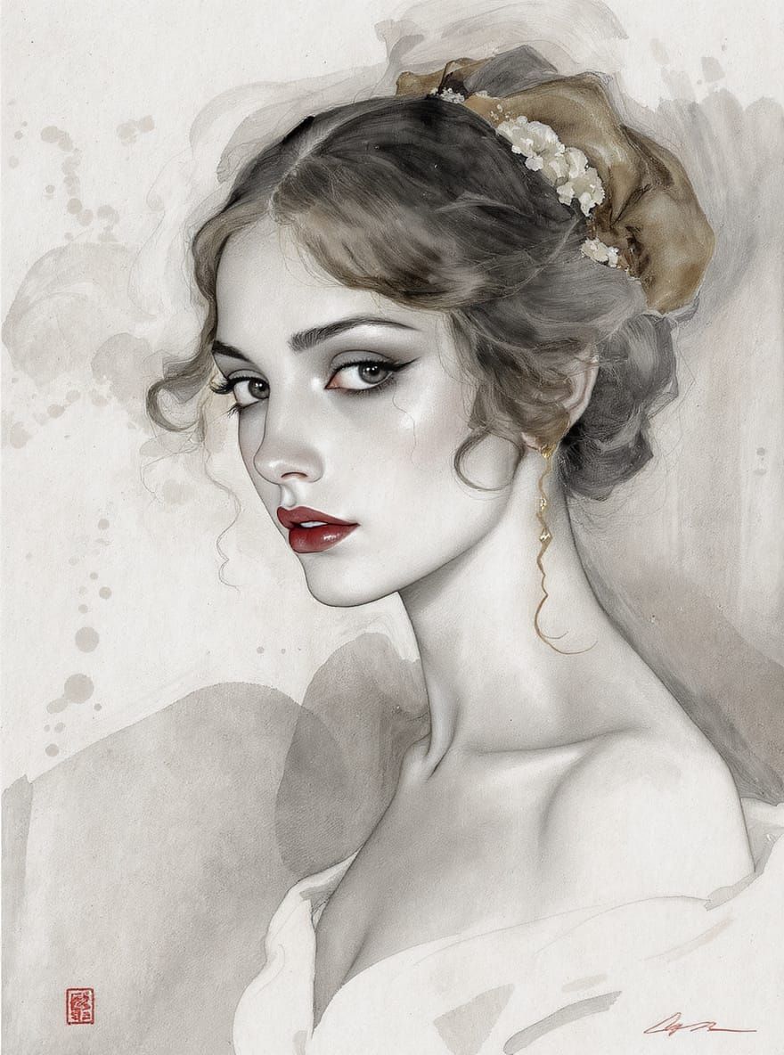 A watercolor portrait of a woman in a thoughtful pose. The image features dynamic brushstrokes, layered washes, and dramatic contrasts, rendered in a soft, ethereal art nouveau style.