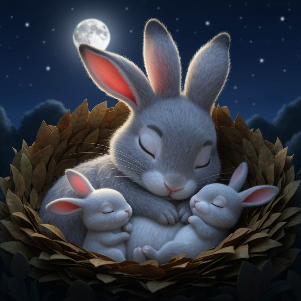 This image showcases a highly detailed CGI scene of a mother rabbit sleeping with her baby bunnies nestled in leaves under the moonlight.