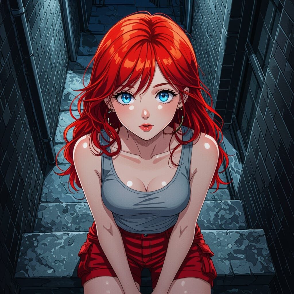This image shows a detailed pen and ink sketch of a young woman with red hair and blue eyes, viewed from above. She wears a tee shirt and shorts, seated in a dark alleyway with dramatic lighting. The style is photorealistic with color accents, resembling anime key visuals.