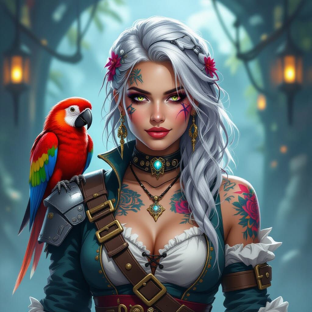 This image depicts a pirate queen with striking silver hair and glowing tattoos, accompanied by a mechanical parrot. Dramatic lighting enhances the scene, rendered as digital art.