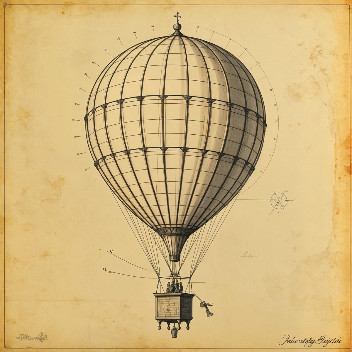 This image shows Leonardo Da Vinci-style sketches of hot air balloons with technical annotations. The drawings evoke historical scientific exploration and invention.
