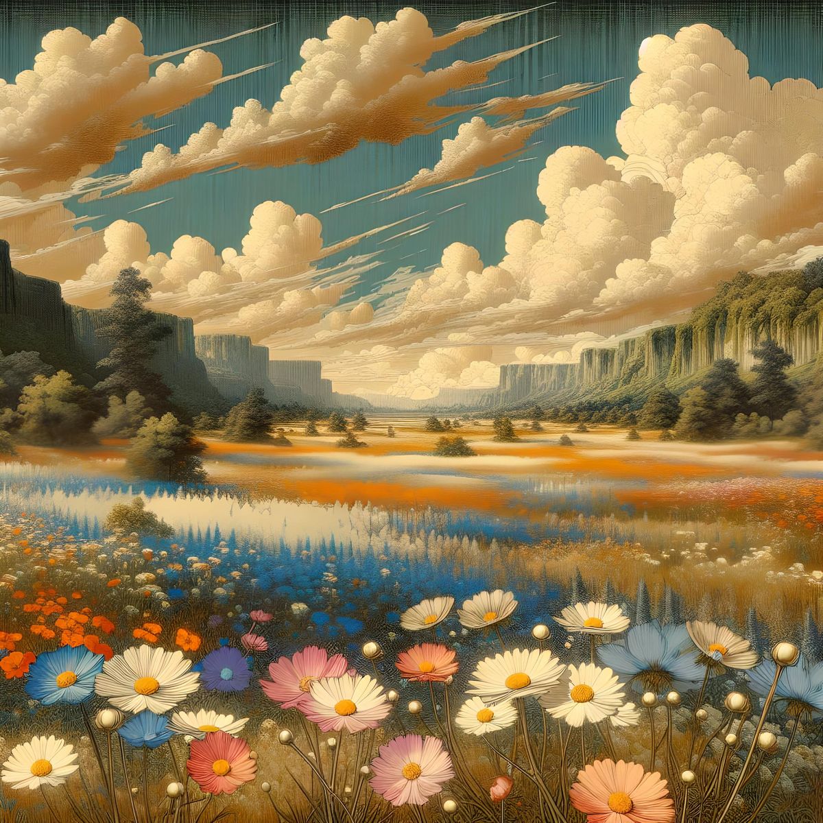 This breathtaking 3D concept art piece captures a serene wildflower field beneath a sky of soft, puffy clouds, evoking the intricate style of historical Japanese ukiyo-e art.