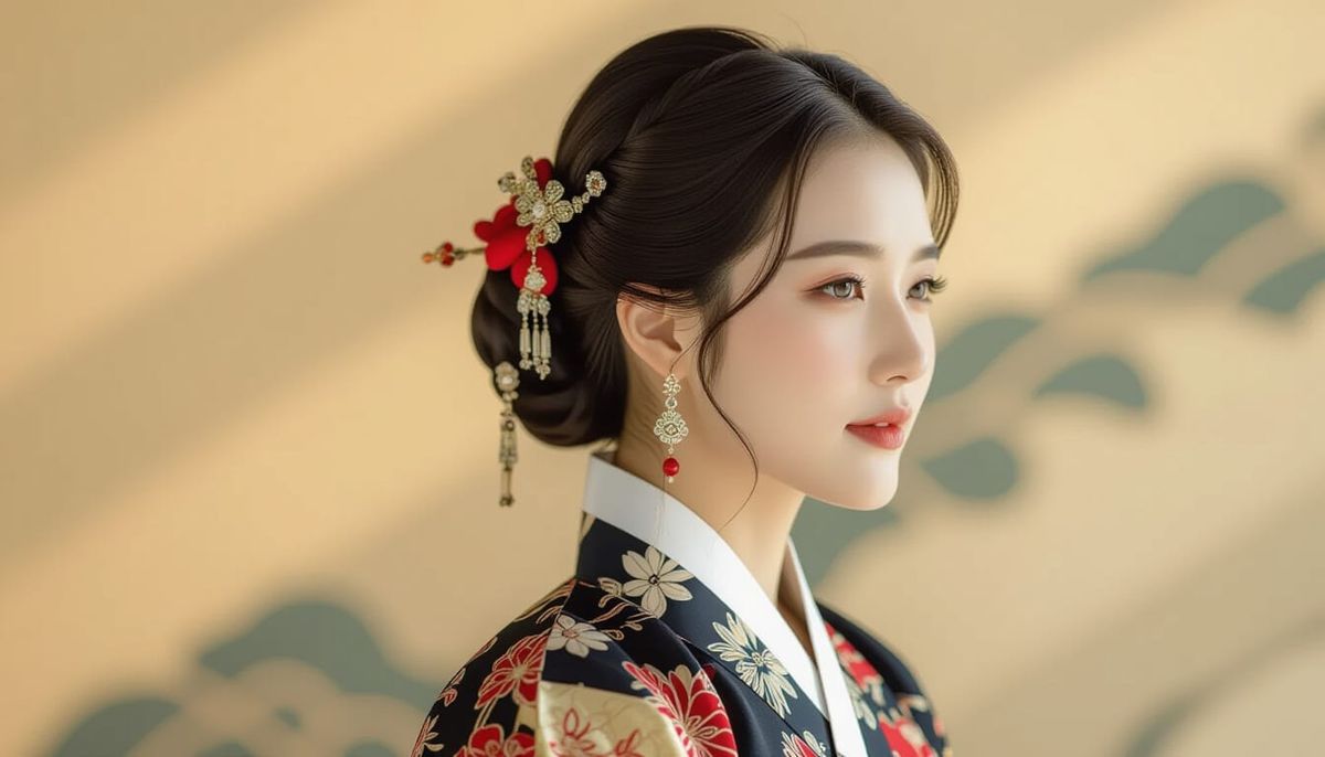 A side profile of a woman in a traditional Korean hanbok, illuminated with Rembrandt lighting to highlight facial features, set against a backdrop of intricate dancheong patterns.