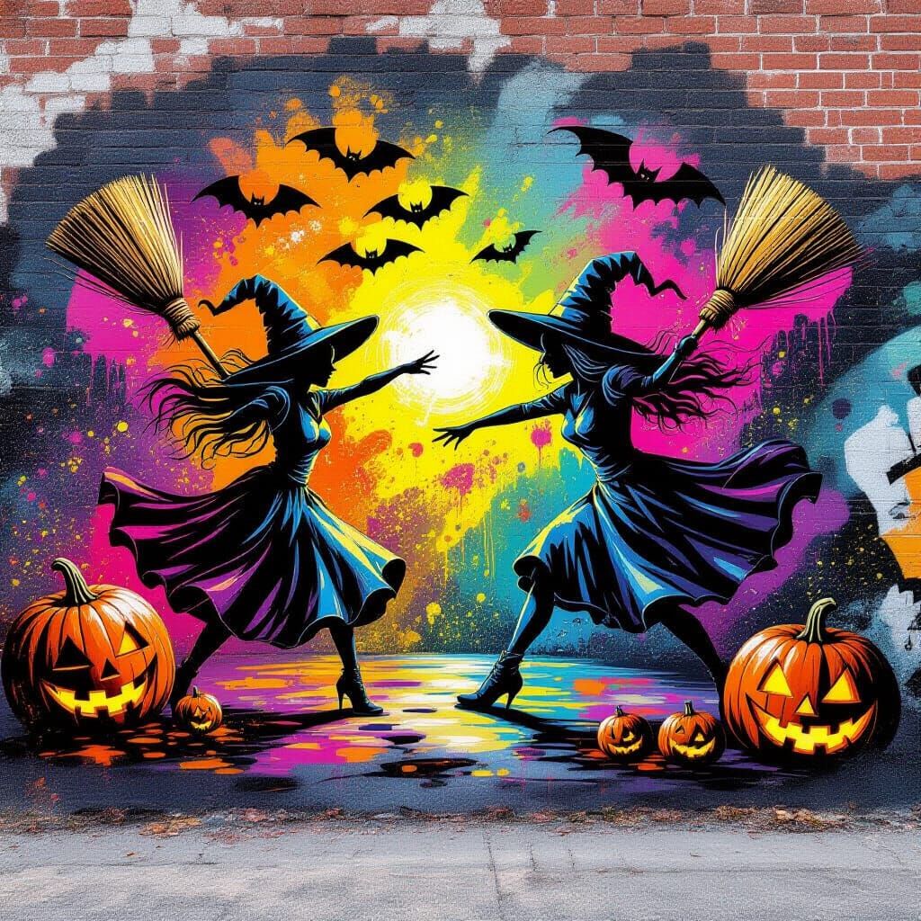 This vibrant graffiti mural showcases broomsticks and pumpkins in a chaotic, colorful dance. Featuring spray paint, melting effects, and acrylic splatters for a high-contrast, ultra-detailed street art look.
