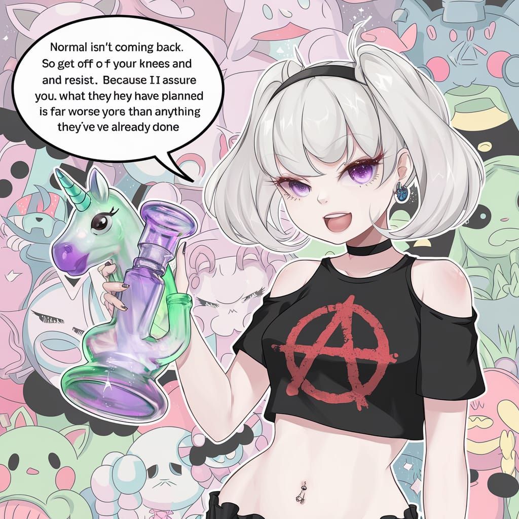 This image shows an anime-style girl with blonde pigtails holding a unicorn bong. She wears a black t-shirt with a red anarchy logo, set against a pastel goth kawaii background.
